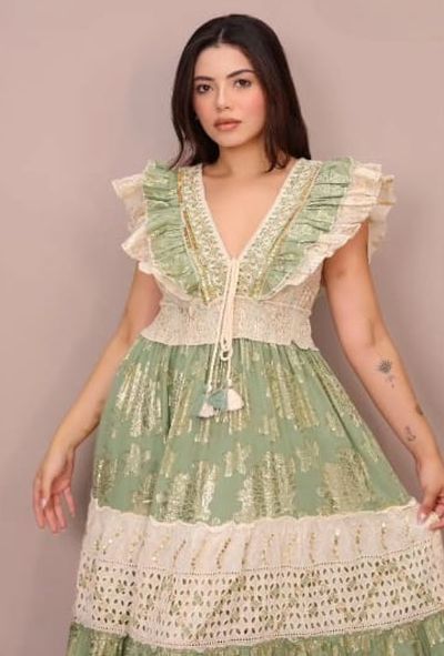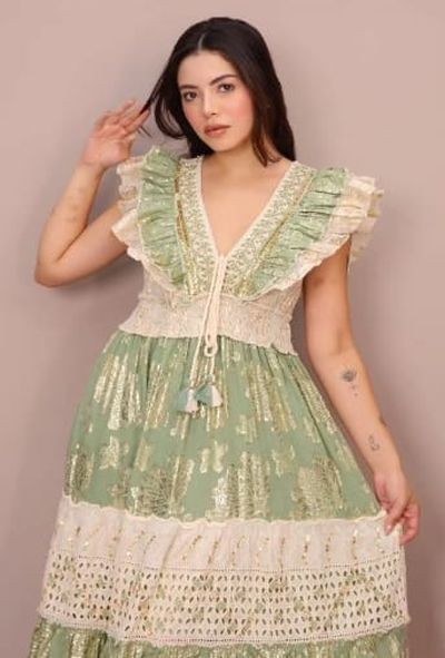 We are a leading Manufacturer, Exporter, and Supplier of this elegant Ladies Cream and Green Cotton Frill Sleeveless A-Line Maxi Dress. Originating from India, this Maxi Dress features a flattering V-neck, made from high-quality Cotton fabric in Cream and Green colors. The full-length dress with sleeveless design offers a comfortable A-line style suitable for daily wear. Embrace the beauty and comfort of this stylish dress that exudes grace and sophistication.